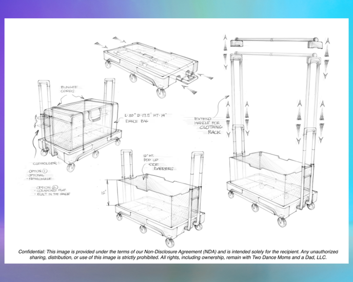 After one especially chaotic weekend in February 2024, Renee looked at Tom and said, “There has to be a better way. Help me solve this.” That night in our kitchen, The Dance Dolly was born. After nearly two years of dreaming, concepting, 3D designs, and three prototypes, it’s here—designed by dance parents for dance parents. It transports any size dance bag with the rack up, converts to a rolling costume rack in seconds, and keeps all your essentials organized. Telescoping handles, a quick-fit costume rod, and an optional insulated costume box work together to cut trips and calm the chaos.